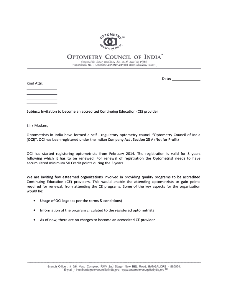 Kind Attn: Date: Subject: Invitation to become an accredited Continuing Education (CE) provider Sir / Madam, Optometrists in India have formed a self-regulatory optometry council of India (OCI). OCI