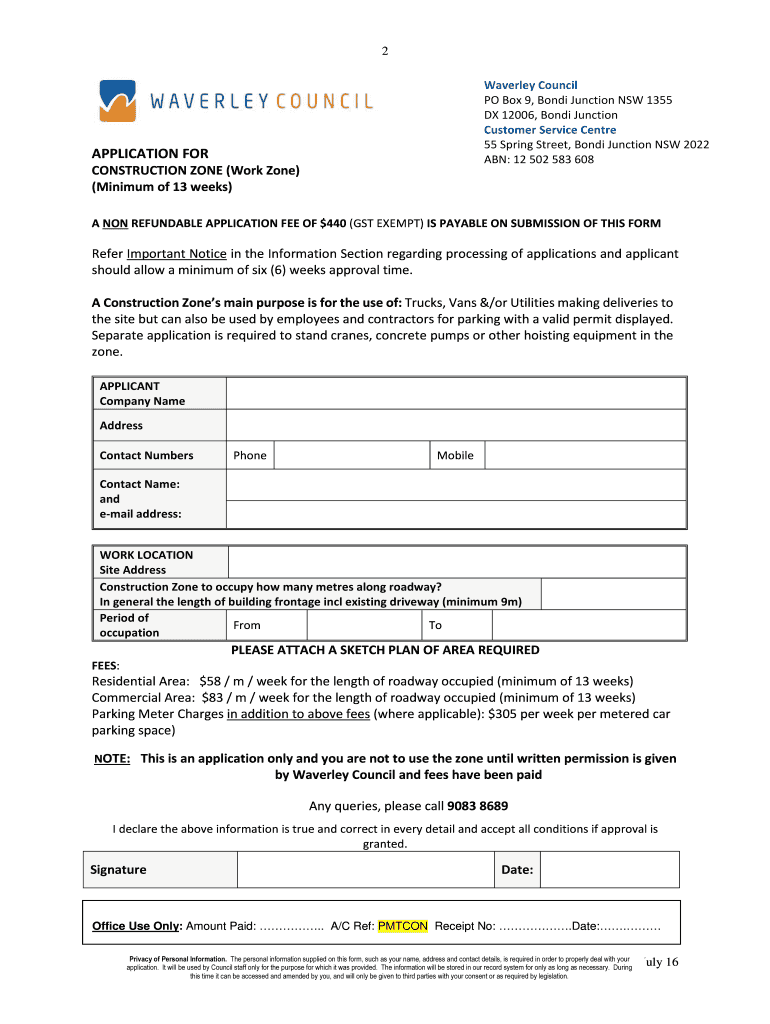 July 16 2 application for construction zone (work zone) (minimum of 13 weeks) a non-refundable application fee of $440 (GST exempt) is payable on submission of this form