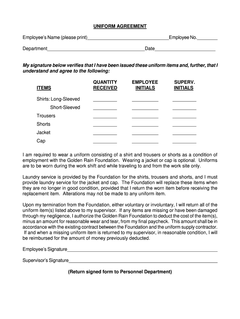 UNIFORM AGREEMENT Employees Name (please print) Employee No. Department Date My signature below verifies that I have been issued these uniform items and, further, that I understand and agree to the