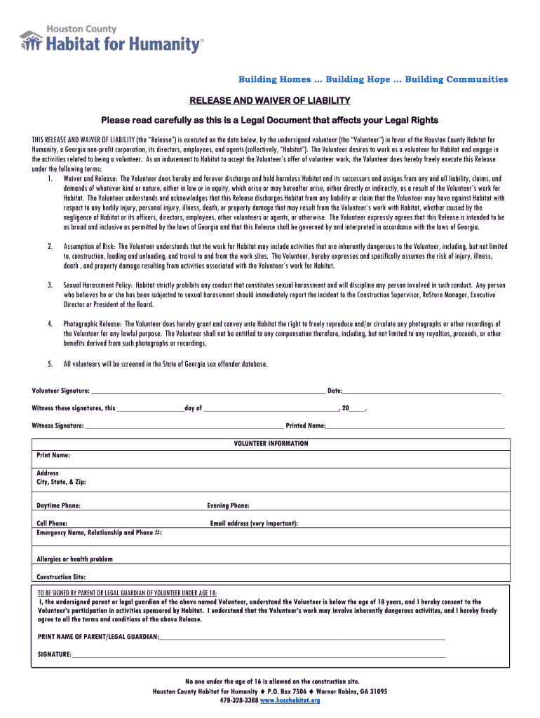 Building Homes Building Hope Building Communities RELEASE AND WAIVER OF LIABILITY Please read carefully as this is a Legal Document that affects your Legal Rights THIS RELEASE AND WAIVER OF LIABILITY