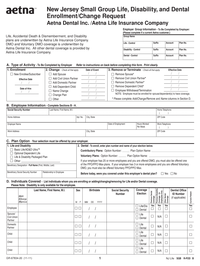 Get the free New Jersey Small Group Life/Disability/Dental Enrollment/Change Request - Aetna. New...