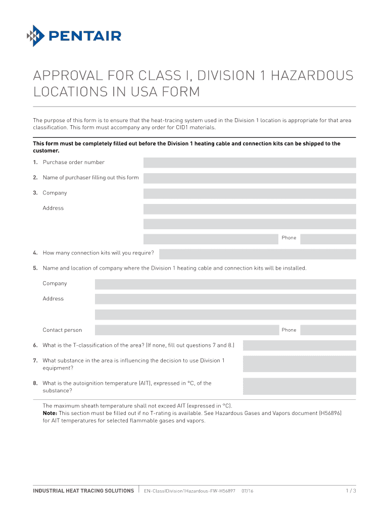 Get the free ClassI Division1 Hazardous Form - Pentair Thermal Management