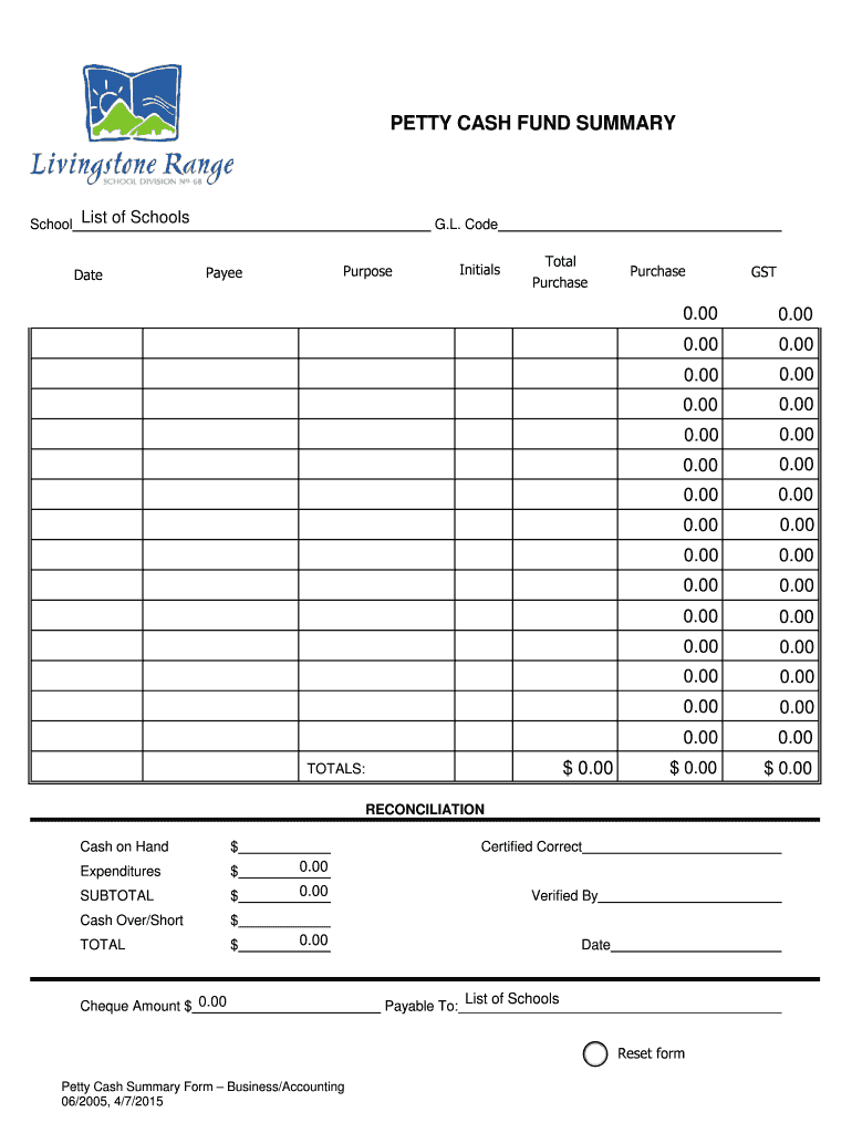 Petty Cash Summary Form Business/Accounting. 06/2005, 4/7/2015. PETTY CASH FUND SUMMARY. School.