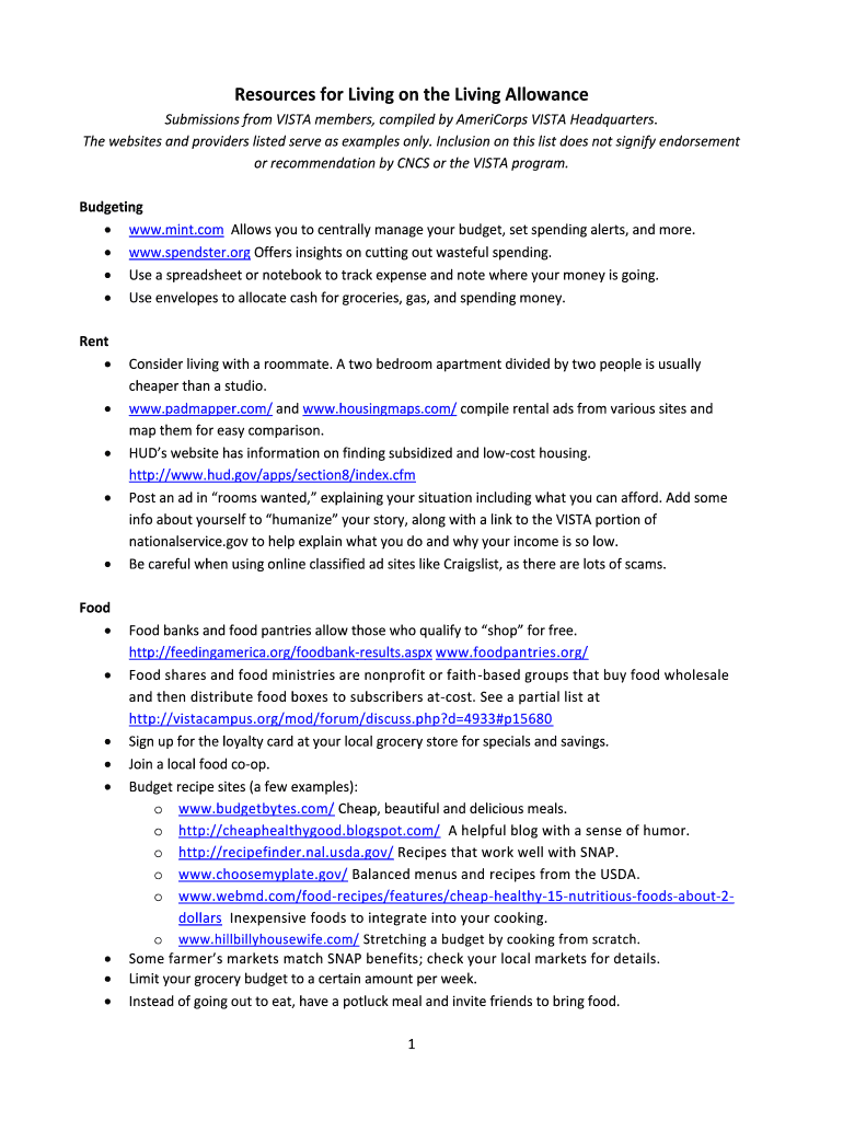 Resources for Living on the Living Allowance Submissions from VISTA members, compiled by AmeriCorps VISTA Headquarters. The websites and providers listed serve as examples only. Inclusion on this