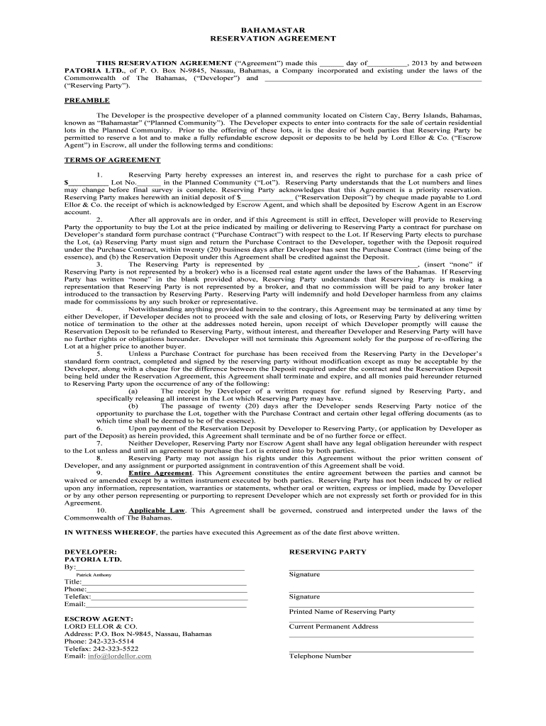 BAHAMAS RESERVATION AGREEMENT THIS RESERVATION AGREEMENT (Agreement) made this day of, 2013 by and between ASTORIA LTD., of P. O. Box N9845, Nassau, Bahamas, a Company incorporated and existing under