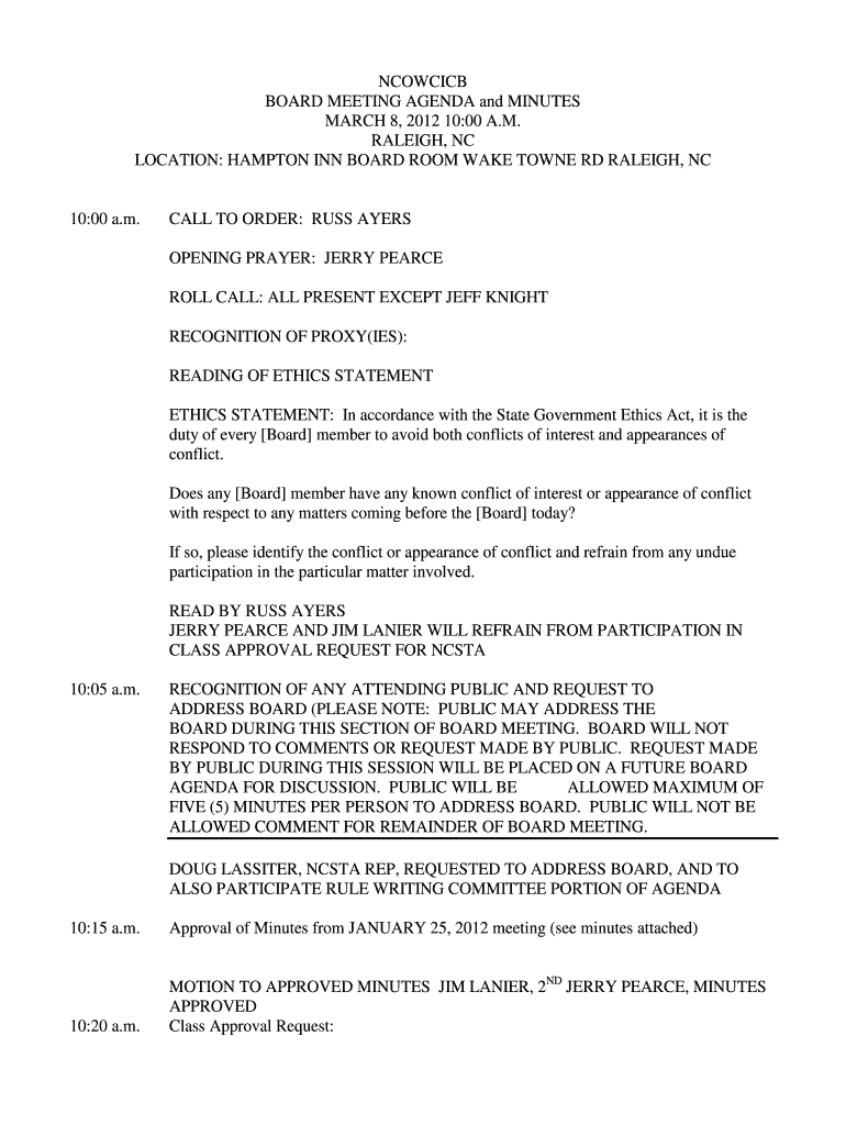 Get the free NCOWCICB BOARD MEETING AGENDA and MINUTES MARCH 8 ... - ncowcicb
