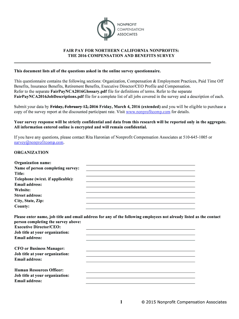 FAIR PAY FOR NORTHERN CALIFORNIA NONPROFITS: THE 2016 COMPENSATION AND BENEFITS SURVEY This document lists all the questions asked in the online survey questionnaire. This questionnaire contains the