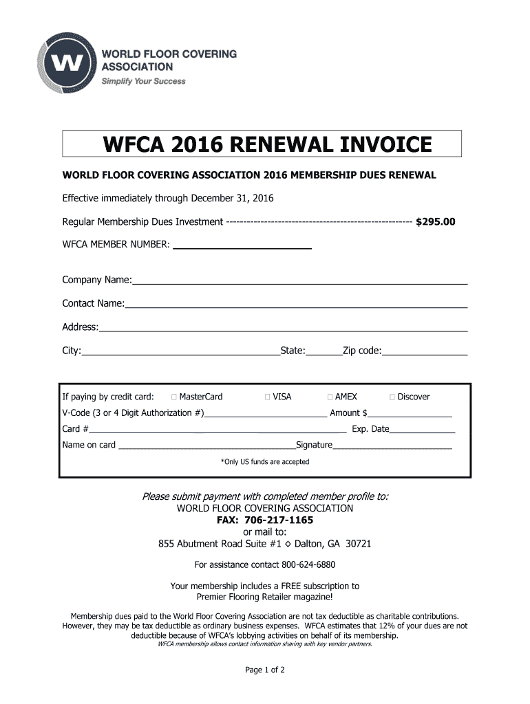 Get the free WORLD FLOOR COVERING ASSOCIATION 2016 MEMBERSHIP DUES RENEWAL - wfca-pro