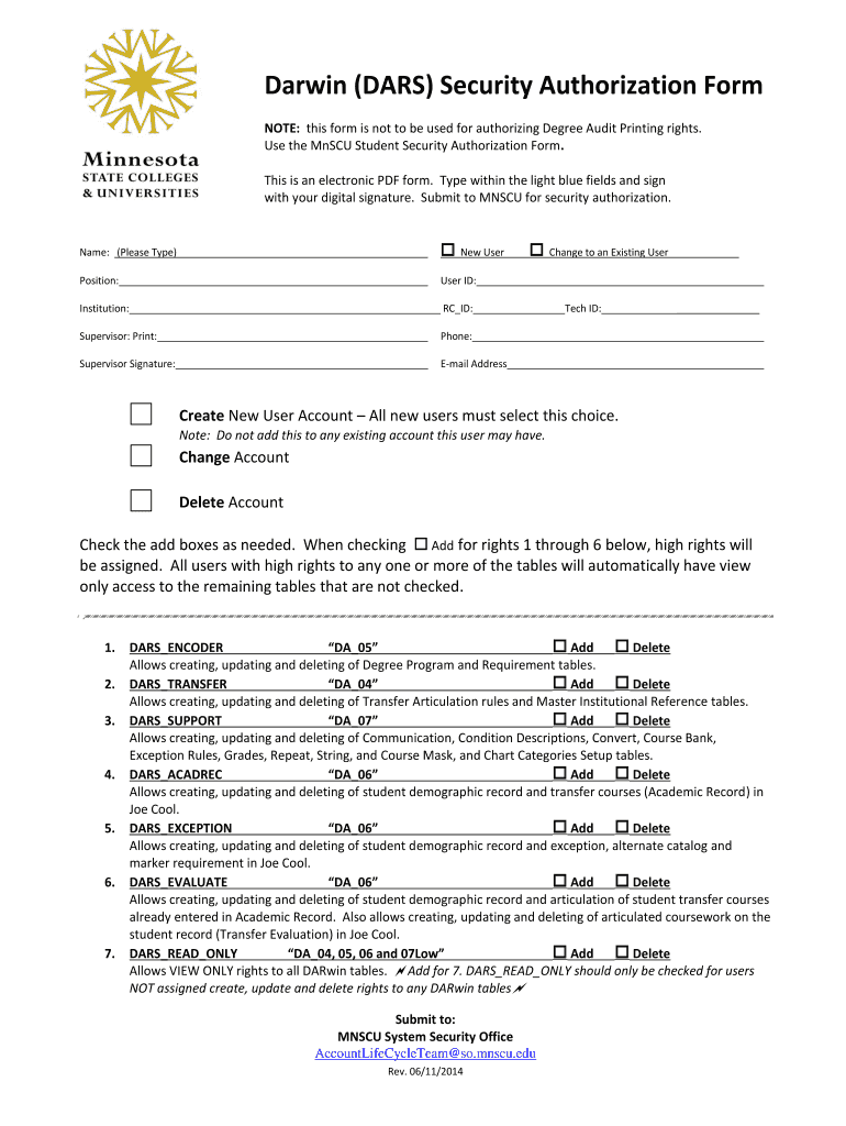 Darwin (DAYS) Security Authorization Form NOTE: this form is not to be used for authorizing Degree Audit Printing rights. Use the Mn SCU Student Security Authorization Form. This is an electronic