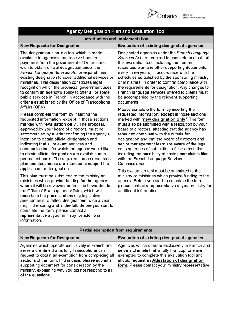 Agency Designation Plan and Evaluation Tool Introduction and Implementation New Requests for Designation Evaluation of existing designated agencies The designation plan is a tool which is made available