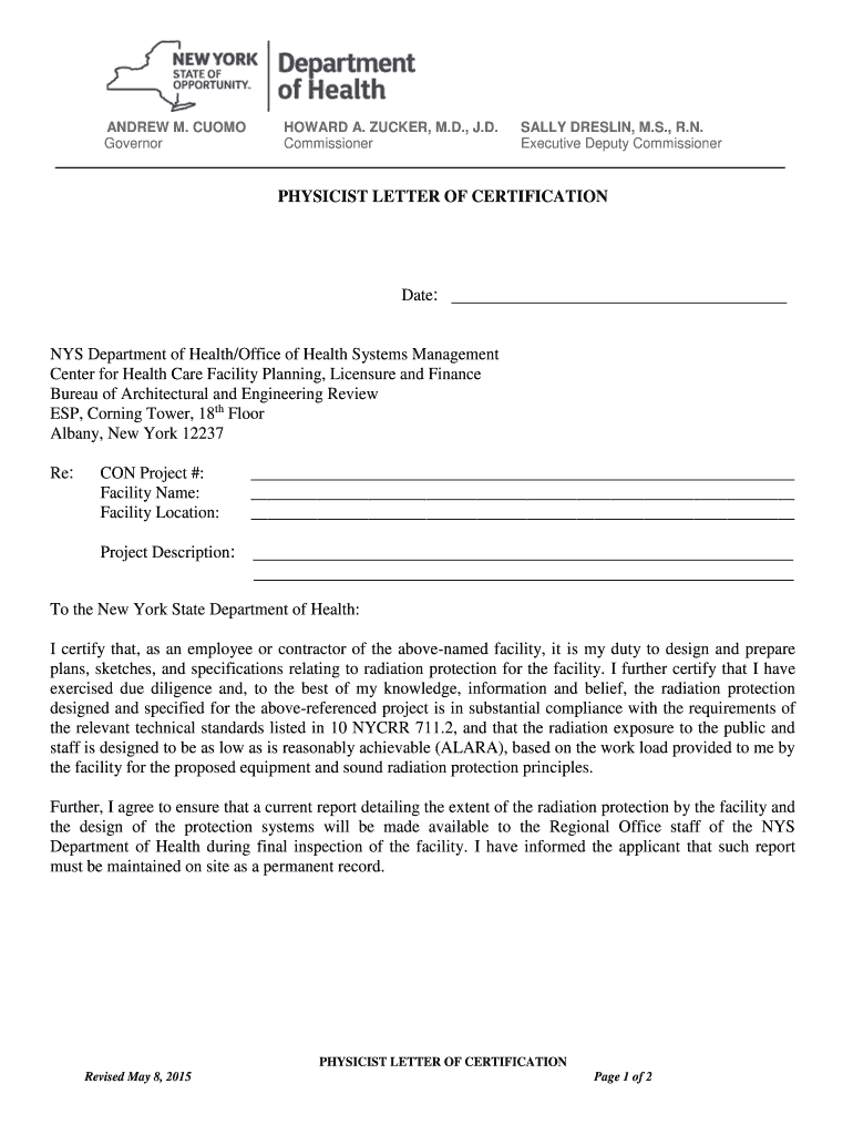 ANDREW M. CUOMO Governor HOWARD A. TUCKER, M.D., J.D. Commissioner SALLY DRESSING, M.S., R.N. Executive Deputy Commissioner PHYSICIST LETTER OF CERTIFICATION Date: NYS Department of Health/Office