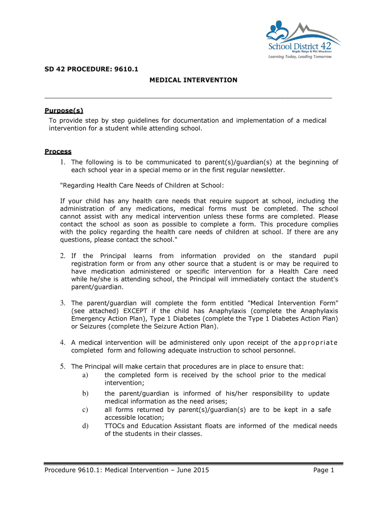 SD 42 PROCEDURE: 9610.1 MEDICAL INTERVENTION Purpose(s) To provide step by step guidelines for documentation and implementation of a medical intervention for a student while attending school. Process