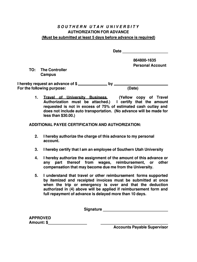 Get the free Authorization For Advance Form Instructions: - suu