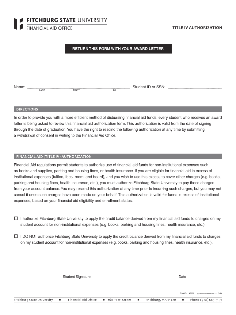TITLE IV AUTHORIZATION RETURN THIS FORM WITH YOUR AWARD LETTER Name: Student ID or SSN: LAST FIRST MI DIRECTIONS In order to provide you with a more efficient method of disbursing financial aid funds,