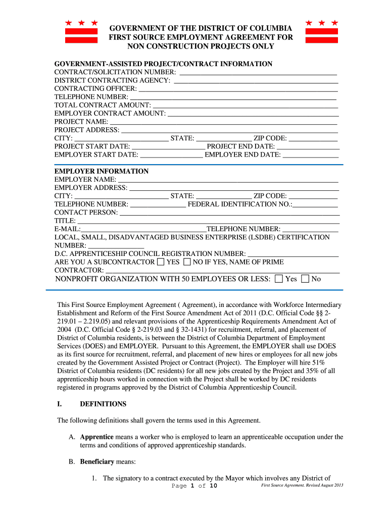 GOVERNMENT OF THE DISTRICT OF COLUMBIA FIRST SOURCE EMPLOYMENT AGREEMENT FOR NON CONSTRUCTION PROJECTS ONLY GOVERNMENTASSISTED PROJECT/CONTRACT INFORMATION CONTRACT/SOLICITATION NUMBER: DISTRICT CONTRACTING