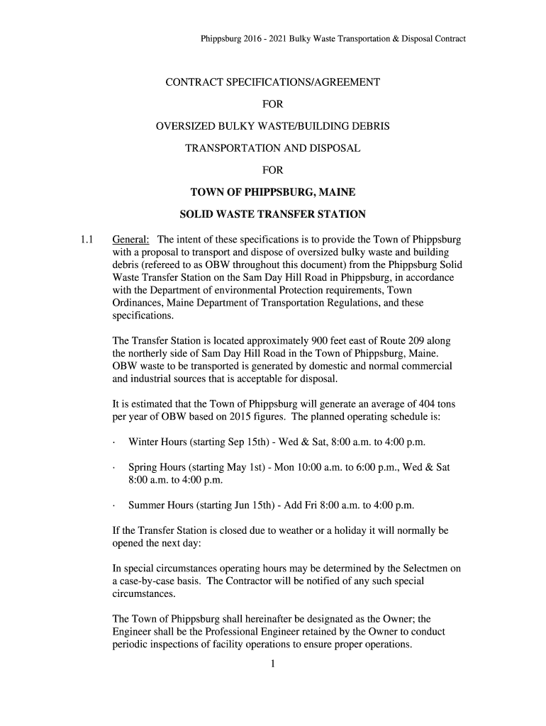 Phipps burg 2016 2021 Bulky Waste Transportation & Disposal Contract SPECIFICATIONS/AGREEMENT FOR OVERSIZED BULKY WASTE/BUILDING DEBRIS TRANSPORTATION AND DISPOSAL FOR TOWN OF PHILIPSBURG, MAINE SOLID