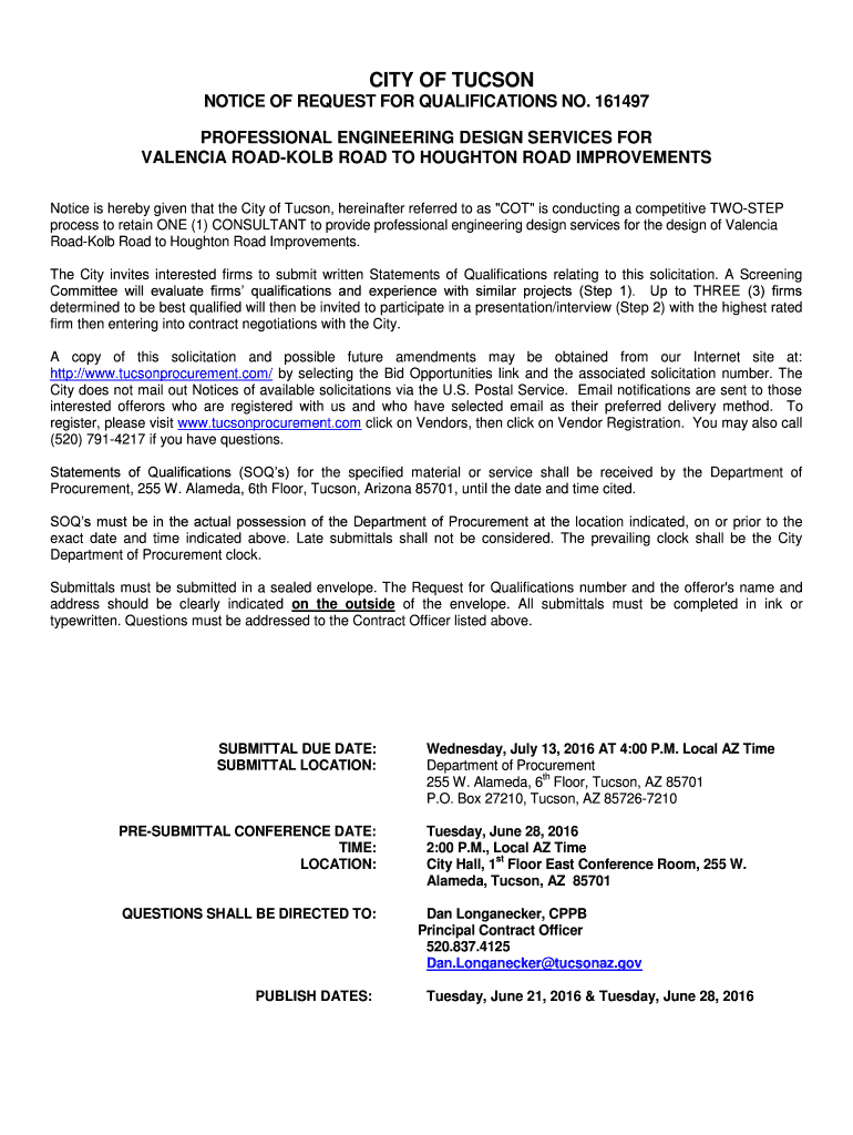 CITY OF TUCSON NOTICE OF REQUEST FOR QUALIFICATIONS NO. 161497 PROFESSIONAL ENGINEERING DESIGN SERVICES FOR VALENCIA ROADKILL ROAD TO HOUGHTON ROAD IMPROVEMENTS Notice is hereby given that the City
