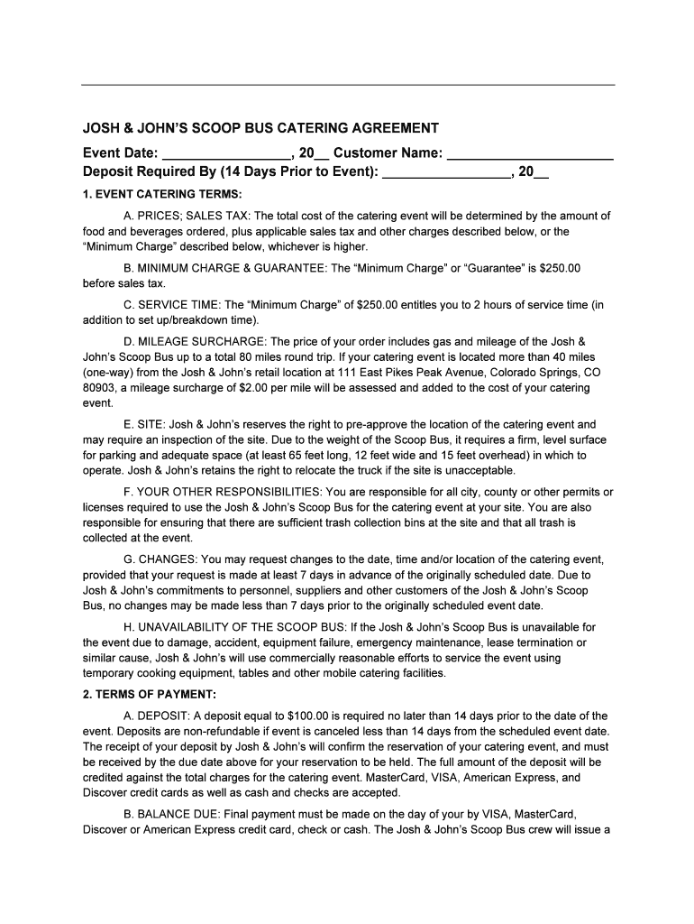 JOSH & JOHNS SCOOP BUS CATERING AGREEMENT Event Date:, 20 Customer Names: Deposit Required By (14 Days Prior to Event):, 20 1. EVENT CATERING TERMS: A. PRICES; SALES TAX: The total cost of the catering