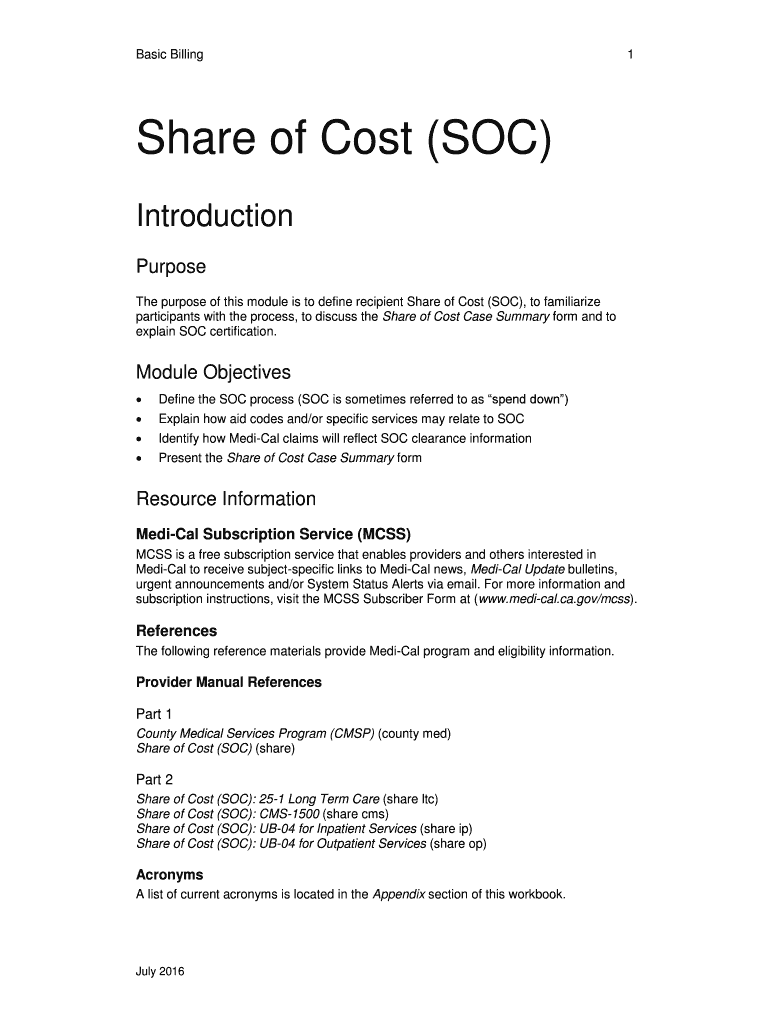 Basic Billing 1 Share of Cost (SOC) Introduction Purpose The purpose of this module is to define recipient Share of Cost (SOC), to familiarize participants with the process, to discuss the Share of