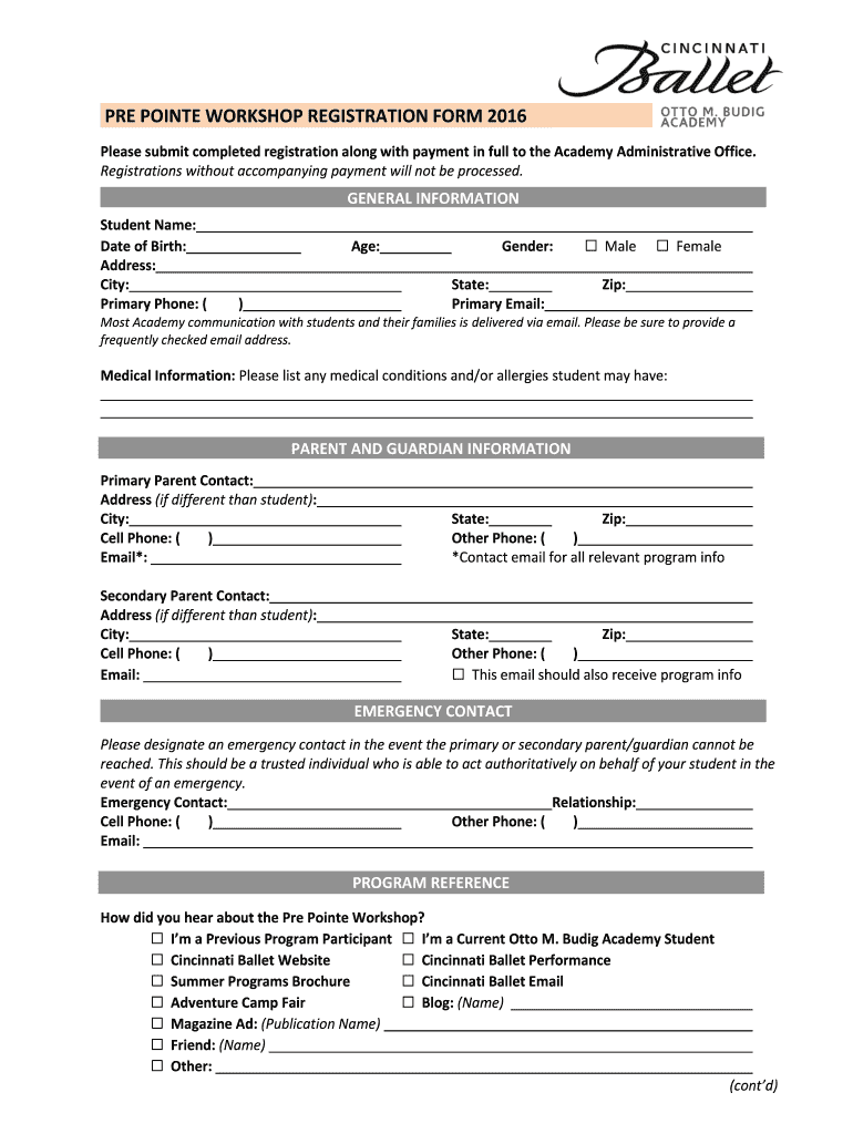 Get the free PRE POINTE WORKSHOP REGISTRATION FORM 2016