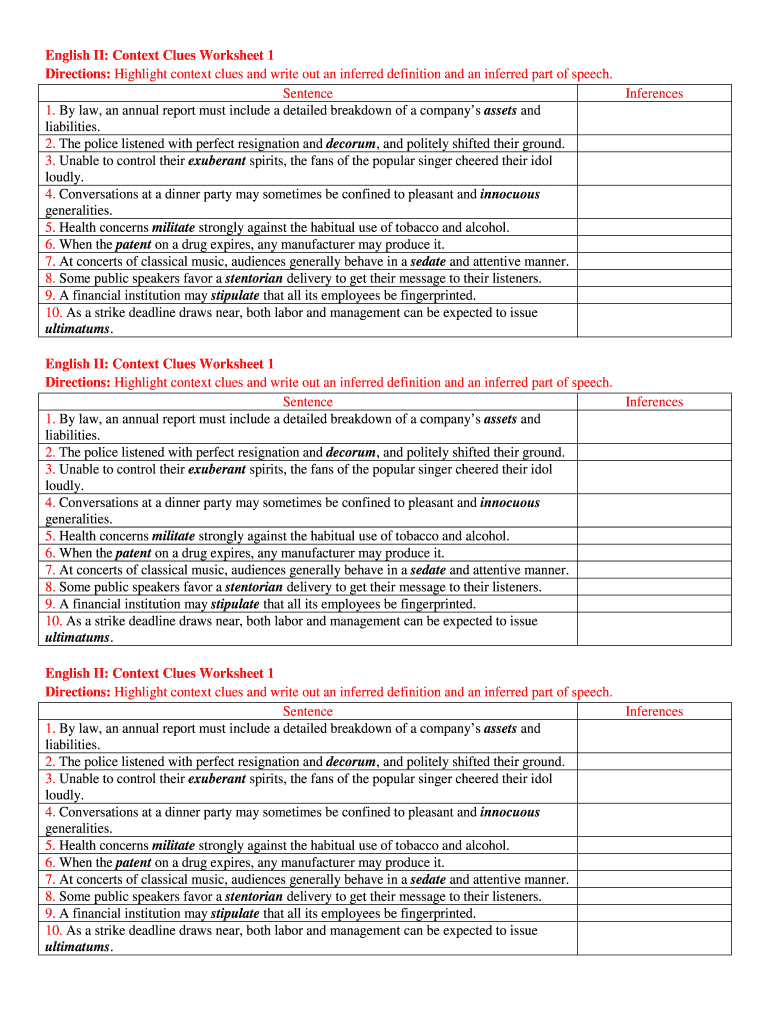 In order to fill out English II context clues, it is important to first understand what they are. Context clues are hints or information that can be found within a text to help determine the meaning of unfamiliar words or phrases. It is a vital skill to develop as it helps improve reading comprehension and vocabulary acquisition.