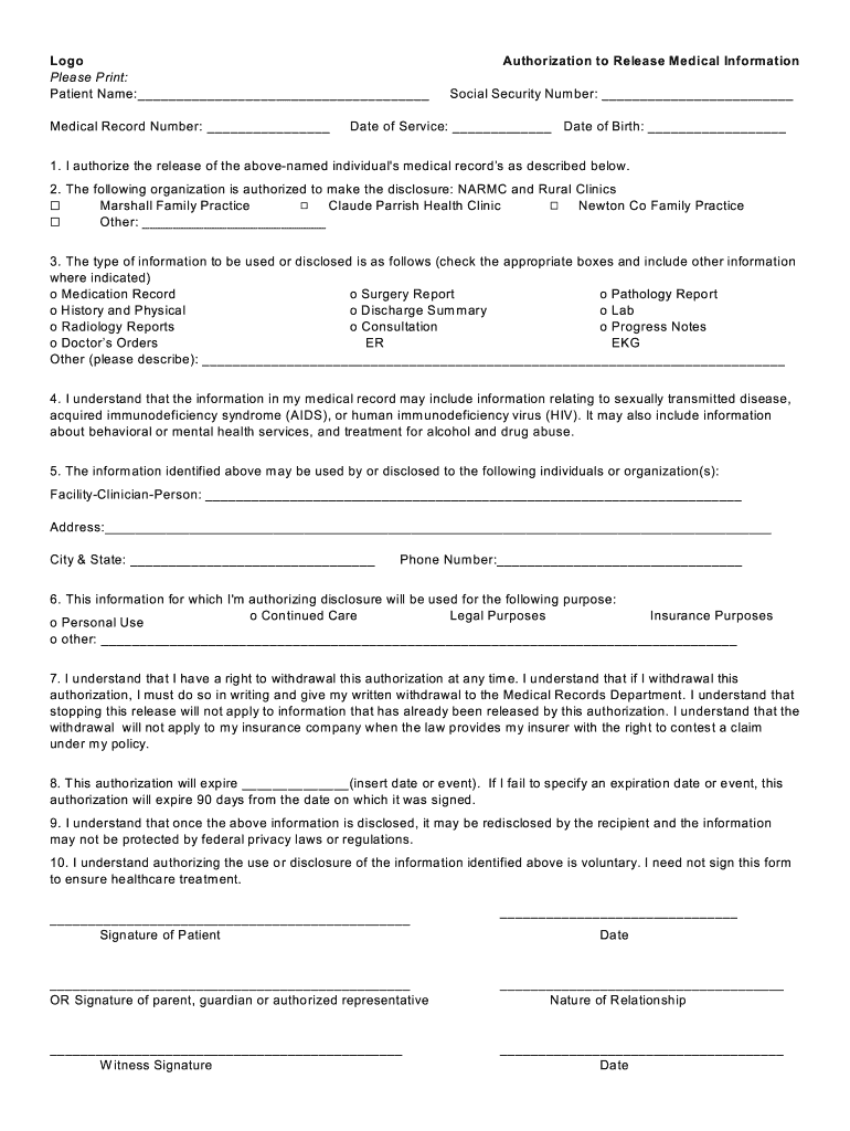 Logo Please Print: Patient Name: Medical Record Number: Authorization to Release Medical Information Social Security Number: Date of Service: Date of Birth: 1. I authorize the release of the above