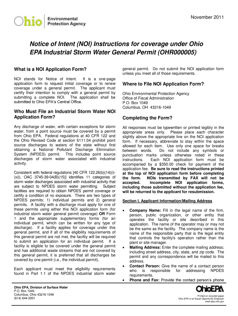 November 2011 Notice of Intent (NOI) Instructions for coverage under Ohio EPA Industrial Storm Water General Permit (OHR000005) What is a NOI Application Form? NOI stands for Notice of Intent. It