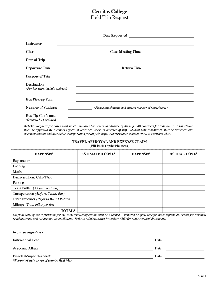 Information such as destination, purpose, date, transportation arrangements, emergency contact information, and student roster must be reported on the cerritos college field trip paperwork.