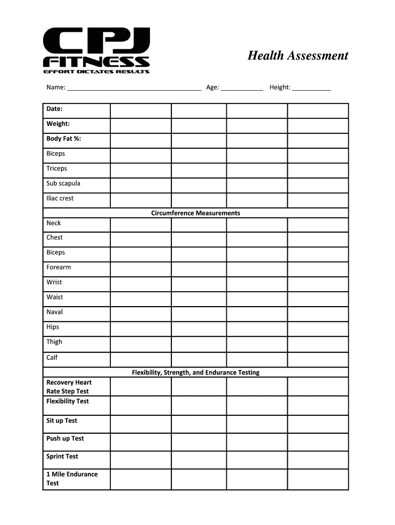 Health Assessment Name: Age: Height: Date: Weight: Bodycam: Biceps Triceps Subscapula Iliaccrest Neck Chest Biceps Forearm Wrist Waist Naval Hips Thigh Calf CircumferenceMeasur