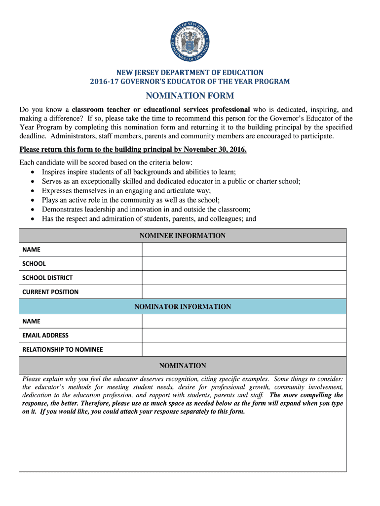 NEW JERSEY DEPARTMENT OF EDUCATION. 2016-17 GOVERNOR S EDUCATOR OF THE YEAR PROGRAM. NOMINATION FORM. Do you know a classroom teacher or educational services ...