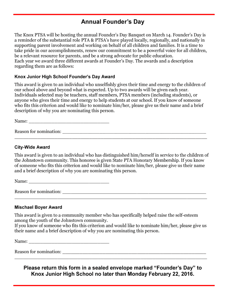 Annual Founders Day The Knox PSA will be hosting the annual Founders Day Banquet on March 14. Founders Day is a reminder of the substantial role PTA & Pass have played locally, regionally, and nationally