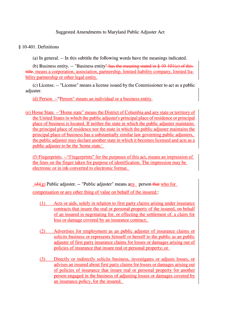 Get the free Suggested Amendments to Maryland Public Adjuster Act 10-401 ...