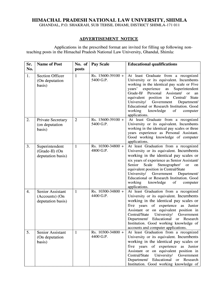 HIMACHAL PRADESH NATIONAL LAW UNIVERSITY, SHIM LA SCANDAL, P.O. SARAH, SUB TENSILE DHA MI, DISTRICT SHIMLA171 011 ADVERTISEMENT NOTICE Applications in the prescribed format are invited for filling