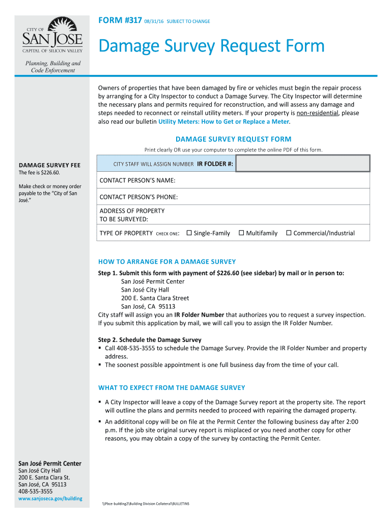 Get the free FORM #317 08 31/16 SUBJECT TO CHANGE Damage Survey... - sanjoseculture