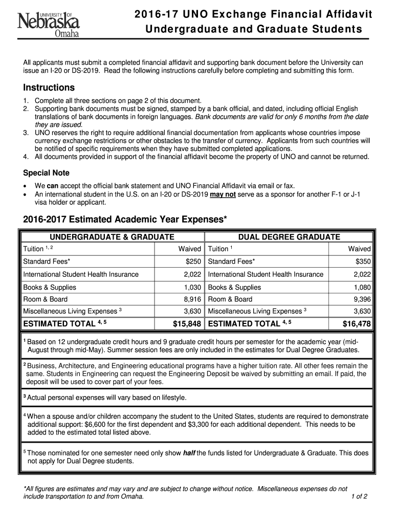 201617 UNO Exchange Financial Affidavit Undergraduate and Graduate Students All applicants must submit a completed financial affidavit and supporting bank document before the University can issue