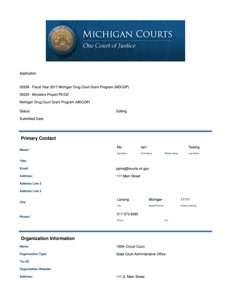 Application 05528 Fiscal Year 2017 Michigan Drug Court Grant Program (MDC GP) 05529 Micheles Project PE/OE Michigan Drug Court Grant Program (MDC GP) Status: Editing Submitted Date: Primary Contact