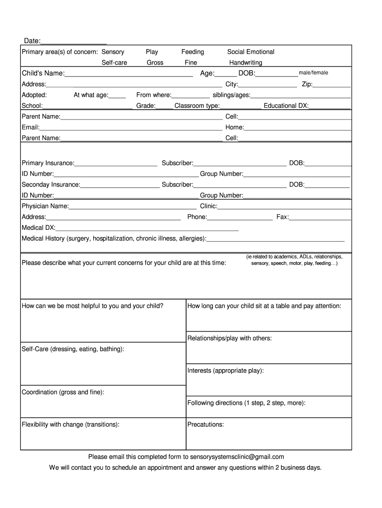 Get the free Intake Form - Sensory Systems Clinic