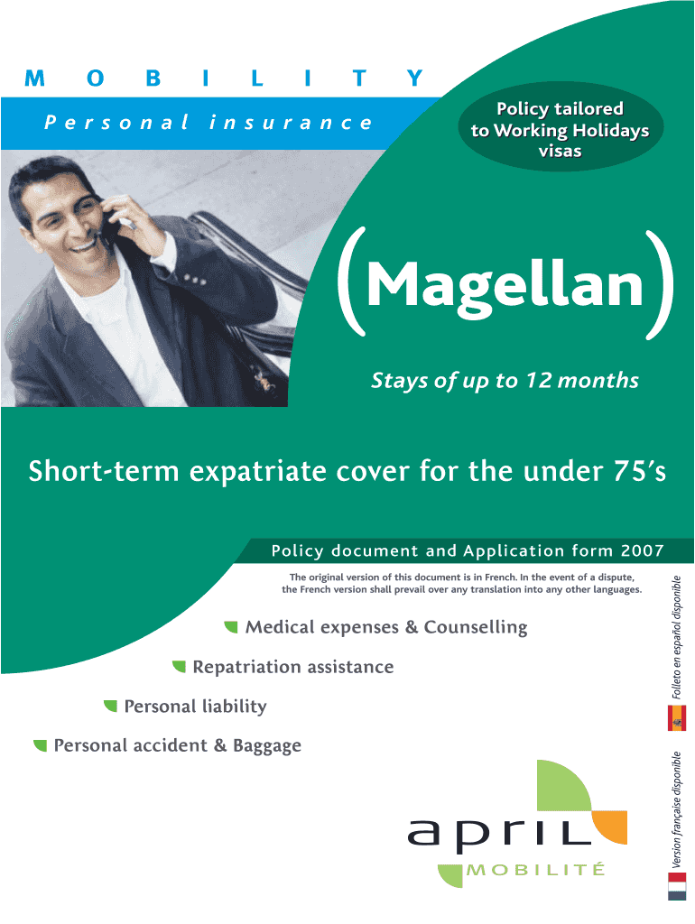 M O B I L I T Y Personal insurance Policy tailored to Working Holidays visas (Magellan) Stays of up to 12 months Short term expatriate cover for the under 75's The original version of this document