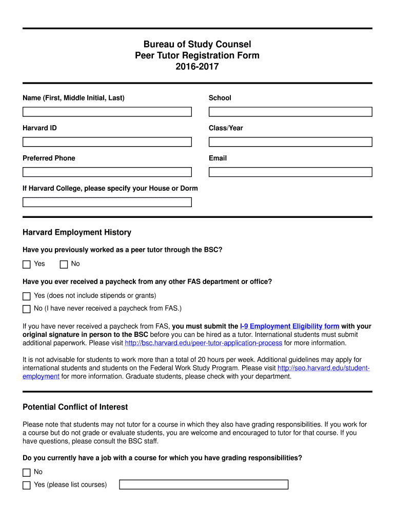 Get the free Bureau of Study Counsel Peer Tutor Registration Form 2016-2017 - bsc harvard