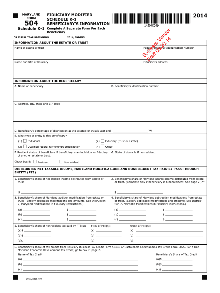 504 Schedule K1 2014 FIDUCIARY MODIFIED SCHEDULE K1 BENEFICIARY INFORMATION Complete A Separate Form For Each Beneficiary Or fiscal year beginning S D oft Ra a ft re 08 V. 2 en 0. D 14 or MARYLAND