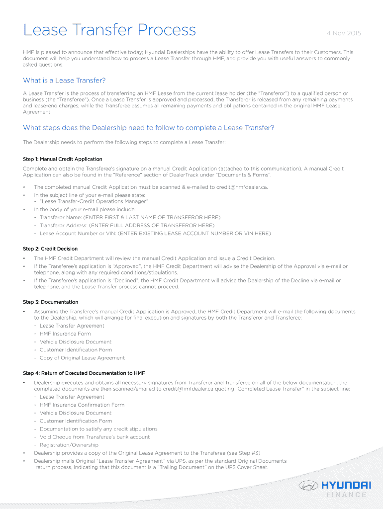 Lease Transfer Process4 Nov 2015HMF is pleased to announce that effective today; Hyundai Dealerships have the ability to offer Lease Transfers to their Customers. This