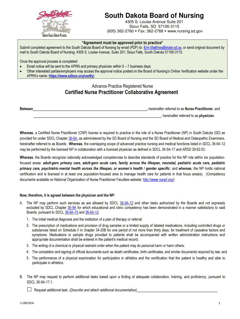South Dakota Board of Nursing 4305 S. Louise Avenue Suite 201 Sioux Falls, SD 571063115 (605) 3622760 Fax: 3622768 www.nursing.sd.gov×Agreement must be approved prior to practice×Submit completed