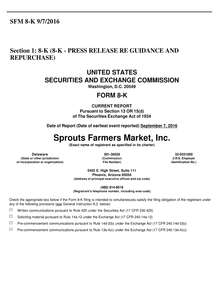 SFM 8K 9/7/2016 Section 1: 8K (8K PRESS RELEASE RE GUIDANCE AND REPURCHASE) UNITED STATES SECURITIES AND EXCHANGE COMMISSION Washington, D.C. 20549 FORM 8K CURRENT REPORT Pursuant to Section 13 OR