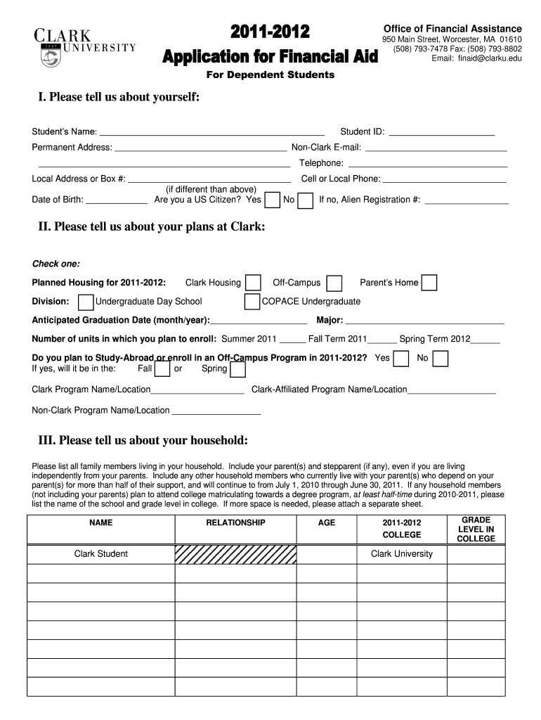The Clark University Financial Aid Application is a financial aid form used by dependent students to apply for financial assistance for the 2011-2012 academic year.