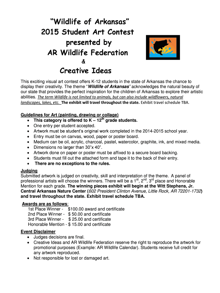 Wildlife of Arkansas 2015 Student Art Contest presented by AR Wildlife Federation & Creative Ideas This exciting visual art contest offers K12 students in the state of Arkansas the chance to display