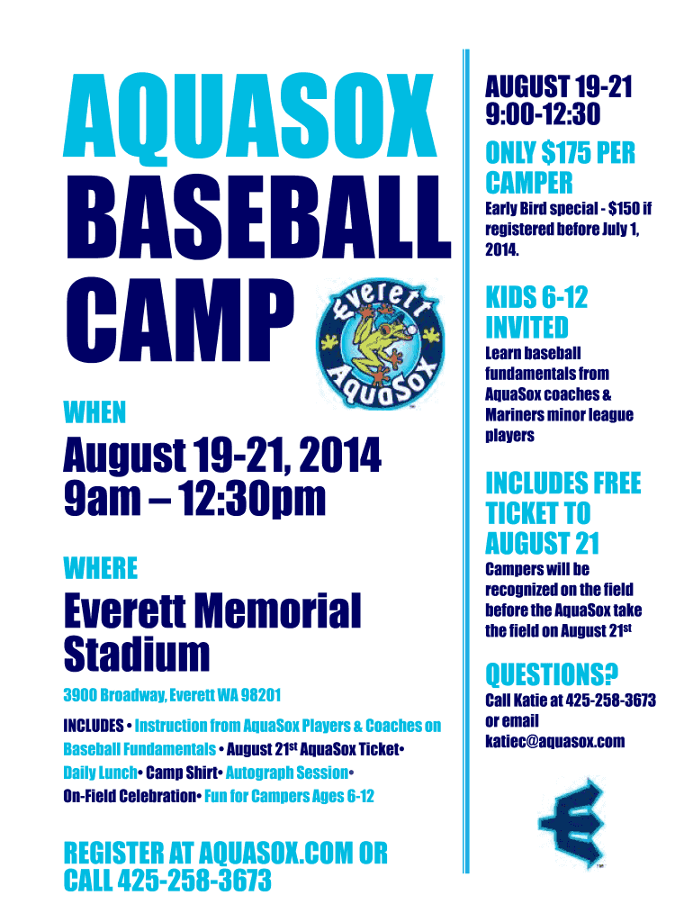 AQUA SOX BASEBALL CAMP WHEN August 1921, 2014 9am 12:30pm WHERE Everett Memorial Stadium 3900 Broadway, Everett WA 98201 INCLUDES Instruction from Aquas ox Players & Coaches on Baseball Fundamentals