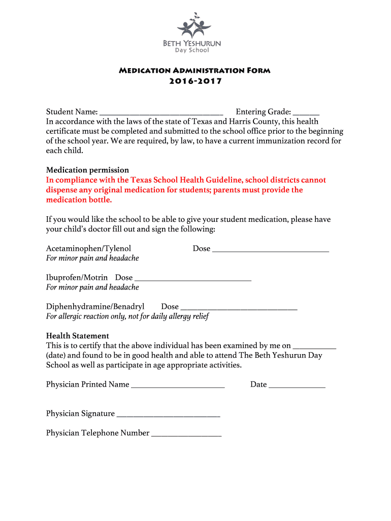 Medication Administration Form. 2016-2017. Student Name: Entering Grade:. In accordance with the laws of the state of Texas and Harris County, this ...