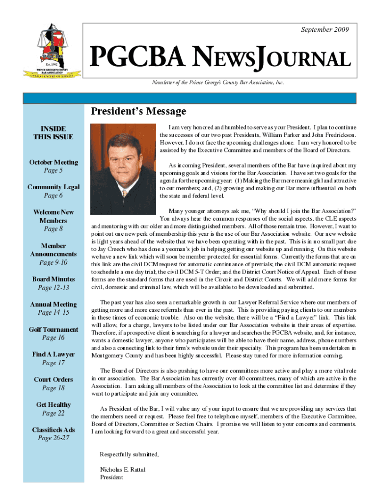 September 2009PGCBA NewsJournal Newsletter of the Prince Georges County Bar Association, Inc. Presidents Message I am very honored and humbled to serve as your President. I plan to continue the successes