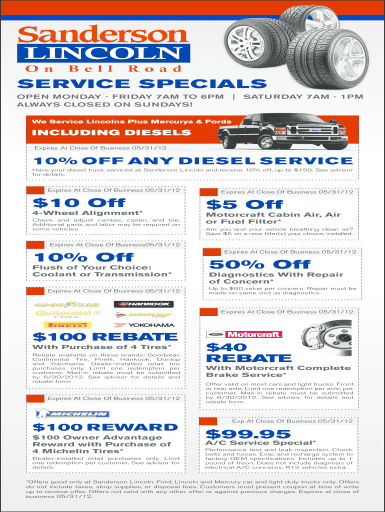 SERVICE SPECIALS OPEN MONDAY FRIDAY 7AM TO 6PM ALWAYS CLOSED ON SUNDAYS! SATURDAY 7AM 1PM We Service Lincolns Plus Mercury's & Fords INCLUDING DIESELS Expires At Close Of Business 05/31/12 10% OFF