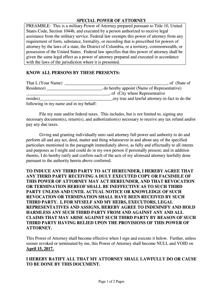 PREAMBLE: This is a military Power of Attorney prepared pursuant to Title 10, United